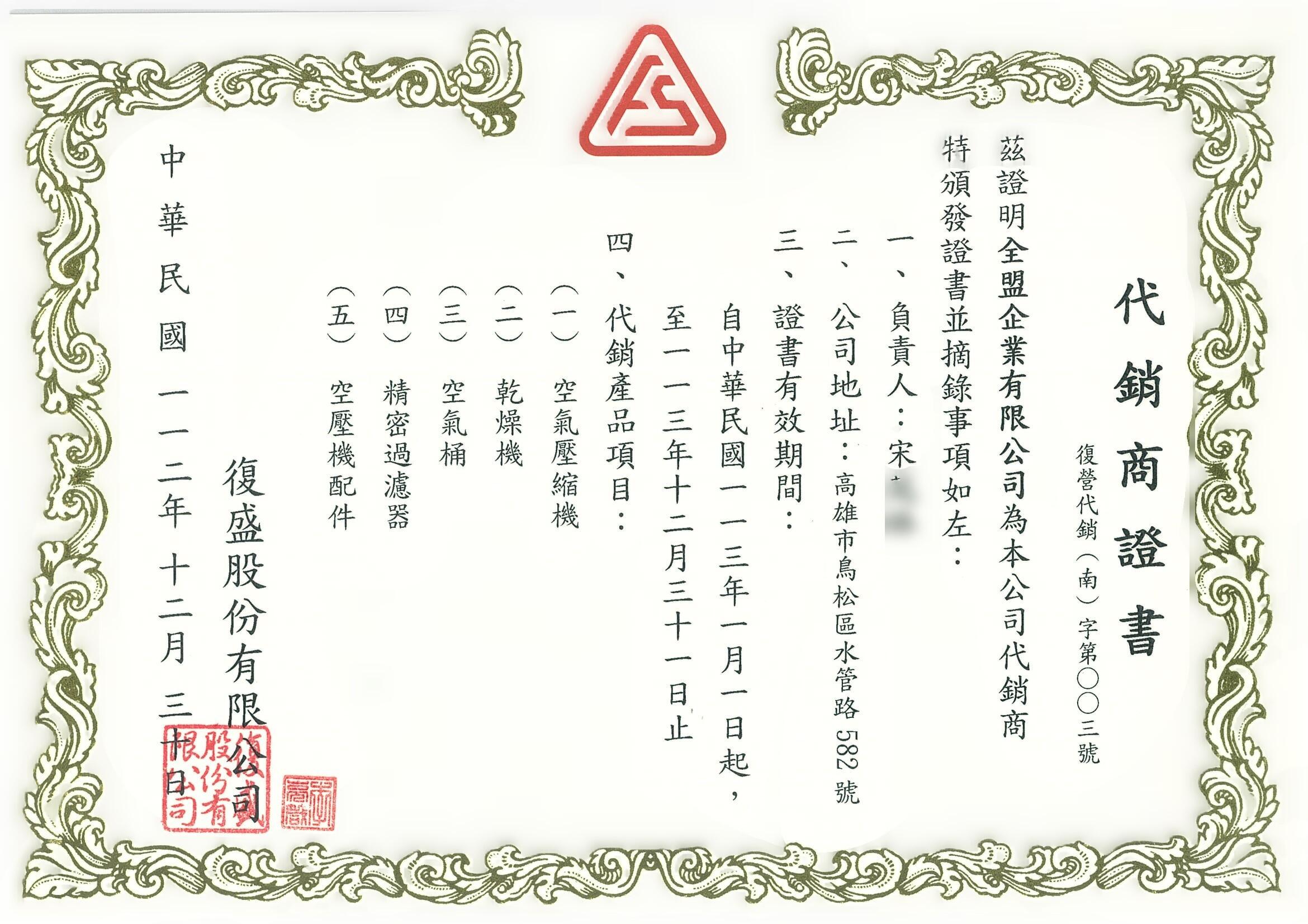全盟企業有限公司服務商證書